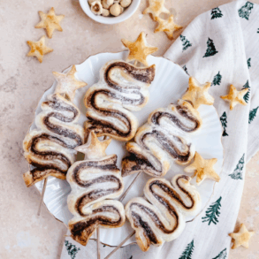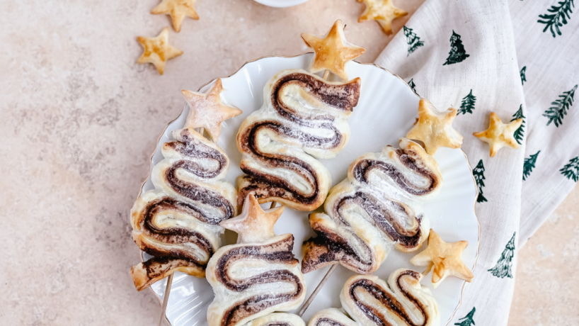Feestelijke bladerdeeg kerstbomen met chocospread en hazelnoten. Makkelijk om te maken, heerlijk knapperig én je kunt de chocospread ook eenvoudig zelf maken!