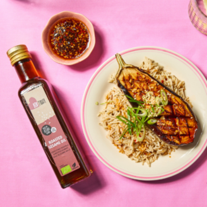 4. Serveer: Verdeel de rijst over de borden. Leg de geroosterde aubergines bovenop de rijst en besprenkel met de