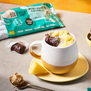 2. Verdeel het beslag over 2 hittebestendige koppen. Leg hier de BioToday Coconut Mini Bars op en bak 2 minuten in de magnetron op 900 Watt. Let op: bak ze niet tegelijk!